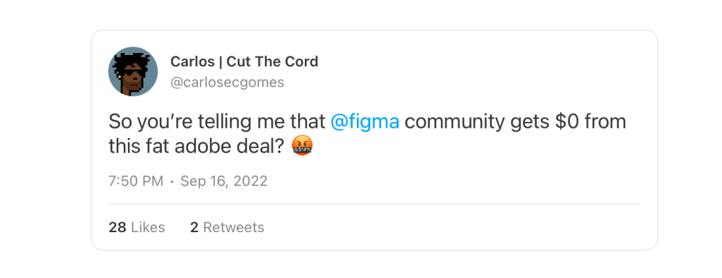 Figma’s community is obviously a key component of what makes Figma valuable, and beyond the question of whether Figma users should get a share of the deal or not, this tweet highlight a profound question: